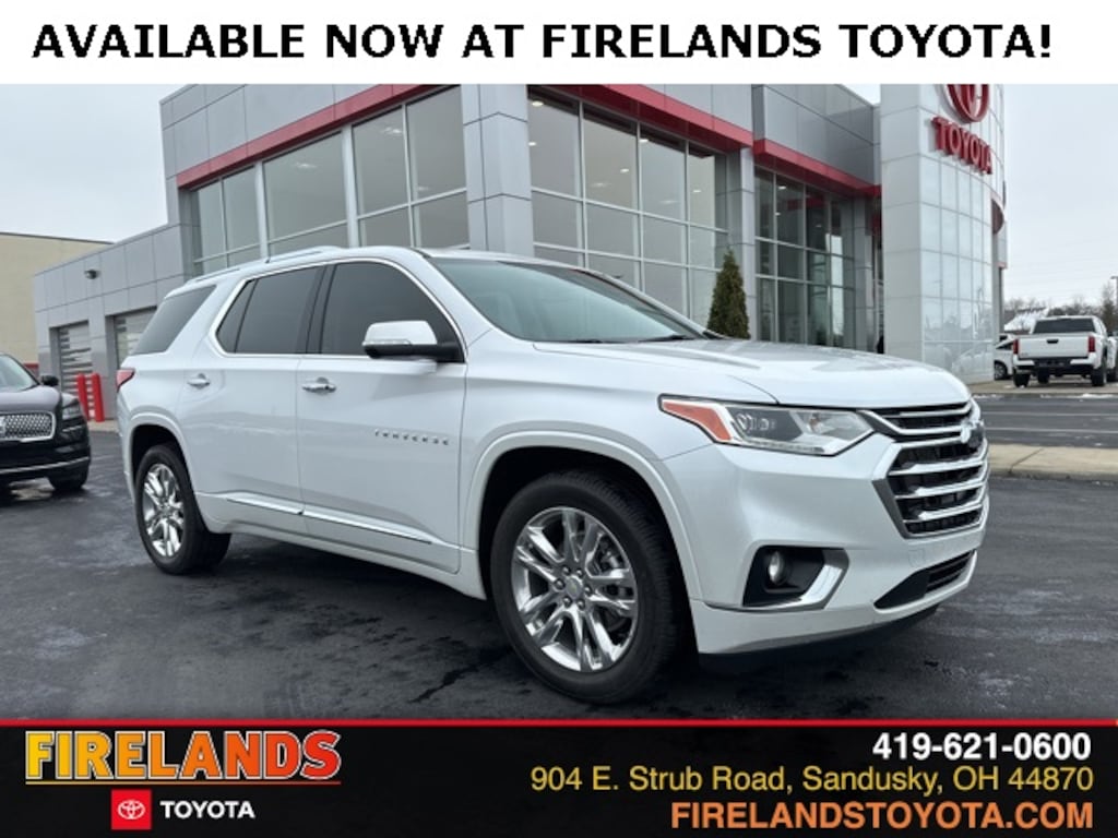 Firelands Toyota is proud to offer this beautiful 2021 Chevrolet Traverse in Iridescent Pearl Tricoat. This Traverse has been checked by our award winning service department. Hot features include; Bluetooth Hands Free, Back Up Camera, Navigation / GPS, Remote Start, Local Trade, Service Records Available, Good Tires, All-Wheel Drive, Heated Leather Seats, 3rd Row Seating, Lane Departure Warning, Apple Carplay, Blind Spot Detection, Fog Lights, Automatic Emergency Braking, Forward Collision Warning, Wireless Charging Pad, 360 Degree Surround View Camera System, Moonroof / Sunroof, One Owner, No Accidents, AWD, 20" Polished Aluminum Wheels, 7-Passenger Seating (2-2-3 Seating Configuration), Heated front seats, Heated rear seats, Navigation System, Power Liftgate, Power moonroof: Dual SkyScape, Preferred Equipment Group 2LZ, Ventilated front seats.